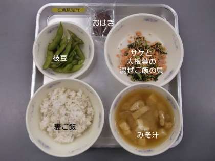 今日は和(なごみ)献立で,『麦ご飯』『みそ汁』『おはぎ』『枝豆』『サケと大根葉の混ぜご飯の具』です。