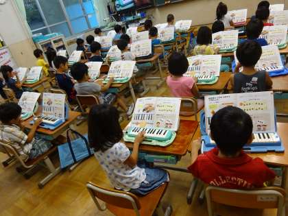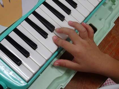 1年生では「けんばんハーモニカ」の学習が始まっています。今日は「ド」「レ」「ミ」の音を,指遣いにも気をつけて演奏しました。