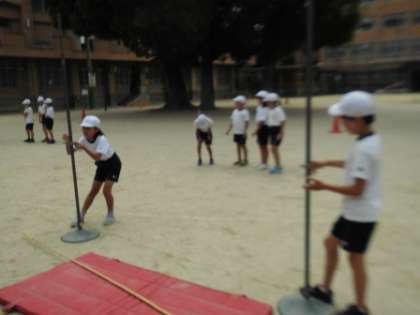 今,体育科で高跳びの学習をしています。はさみ跳びや,3歩助走などがまだまだ難しく,ぎこちない跳び方をしていましたが,友だちどうしのアドバイスで上達してきました。また,道具の準備や片づけ,バーの高さを調節するときには,グループで協力し合っています。お互いに励まし合いながら,どんどんと記録を伸ばしていってほしいと思います。