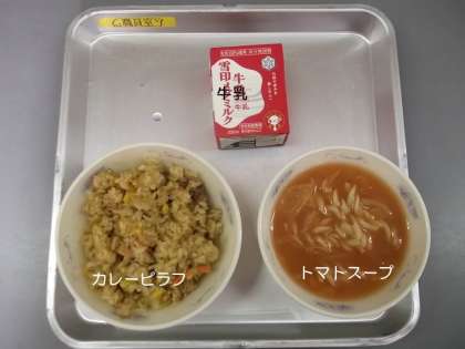 今日の献立は,『カレーピラフ』『トマトスープ』『牛乳』です。