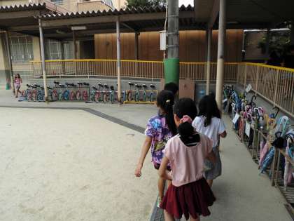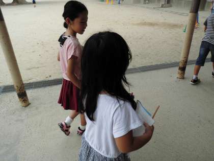 学習の最後には,ストップウォッチを使って校庭を1周し,歩いてかかる時間をはかりました。