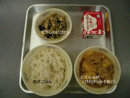 今日の献立は,『むぎごはん』『にくじゃが(ピリ辛みそあじ)』『もやしの煮びたし』『牛乳』です。
