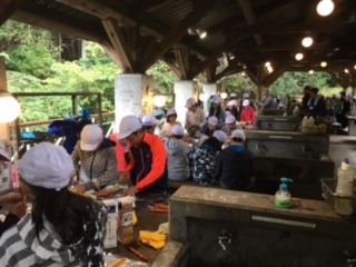 朝食のパックドッグ作りです。グループで協力して作ります。