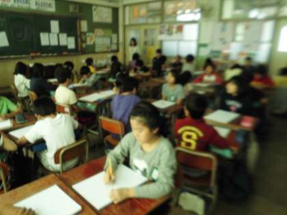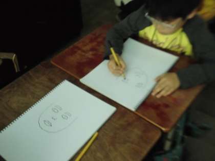 図工科の学習で,人物を描くための練習をしています。前の時間にはにぎりこぶしをかきました。今回は,友だちの顔を描くことに挑戦しました。顔の輪郭や目や鼻の形などを一つずつ丁寧に描いていきました。顔の輪郭を描く時にほっぺたのふくらみを意識したり,上唇と下唇は形が違うということに気づいたりすることができました。スケッチブックには,丁寧に描かれた線で友だちの顔が描かれていました。