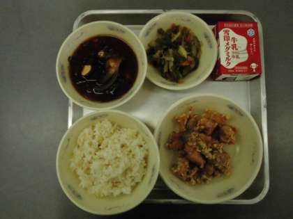 本日のメニューは,『鶏肉のこはくあげ』『アスパラガスのおかか煮』『赤だし』『玄米ご飯』『牛乳』です。『赤だし』には,独特のうまみとこくのある八丁味噌を使っています。鰹でとっただしによく合い,とてもおいしいです。