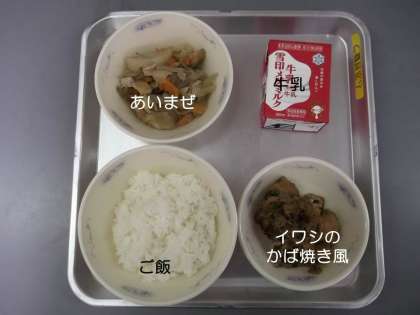 今日の献立は,『ご飯』『イワシのかば焼き風』『あいまぜ』『牛乳』です。