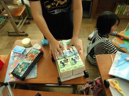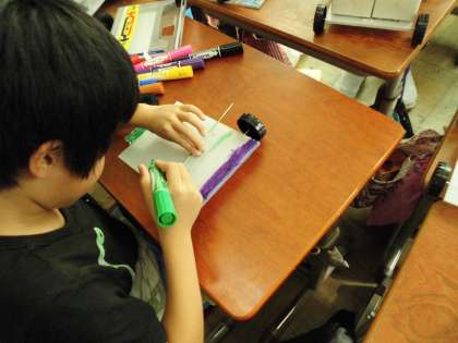 牛乳パックを押し付けたり,タイヤを支える棒に色を塗ったりしています。