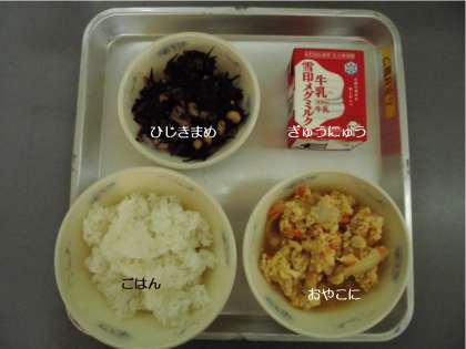 今日の献立は,『ごはん』『親子煮』『ひじき豆』『牛乳』です。