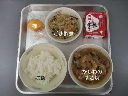 今日の献立は,『ご飯』『かしわのすき焼』『柿』『ごま酢煮』『牛乳』です。