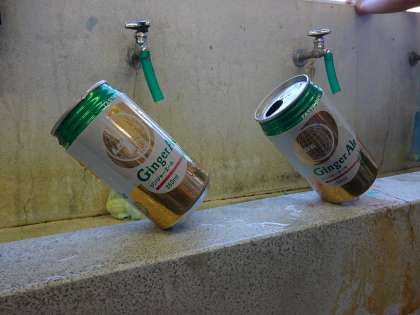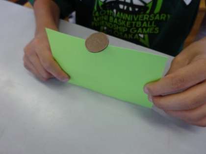 初めに,まっすぐな紙の上に10円玉を乗せる方法を考えたり,空き缶をななめに立てる方法を考えたりしました。