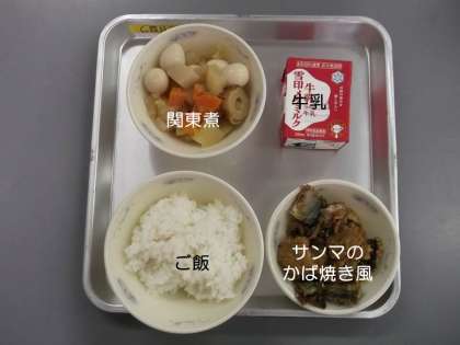 今日の献立は,』ご飯』『サンマのかば焼き風』『関東煮』『牛乳』です。