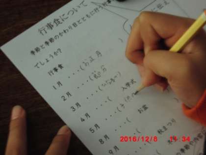 日本には,伝統行事があるときに,いろいろな願いを込めて『行事食』を食べる習慣があります。特に,正月に食べるお節料理について,詳しく教えて頂きました。お節料理に入っている一つ一つの料理に願いが込められていることを知り,子どもたちは感心している様子でした。