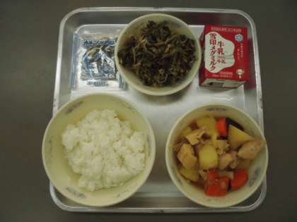 今日の献立は『鶏肉と野菜の煮つけ』『ほうれん草ともやしのごま煮』『ご飯』『牛乳』『じゃこ』です。