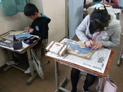 5年のページ 版画を彫り進めています。