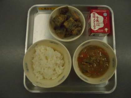 本日の献立は,『ご飯』『厚揚げの野菜あんかけ』『サンマの磯部揚げ』『牛乳』です。