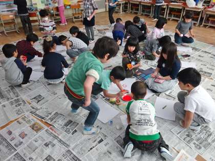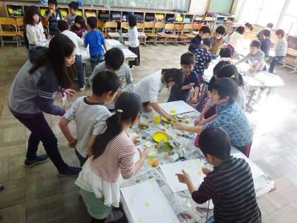 子どもたちは,洗濯バサミやスポンジ,切った野菜などを持ってきて,画用紙にスタンプをしていきました。絵の具の付き具合を調節しながら,きれいに形が写し取れると「きれい!」「やったあ!」と歓声があがっていました。