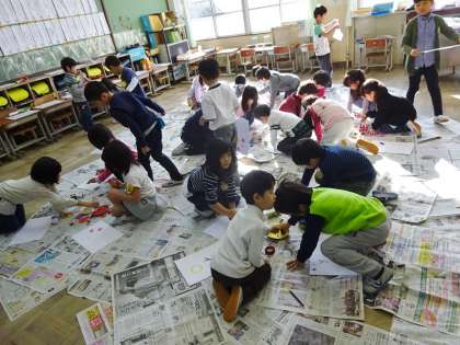 図画工作科「うつした かたちから」で,身近なものに絵の具をつけて形を写し取る学習をしました。