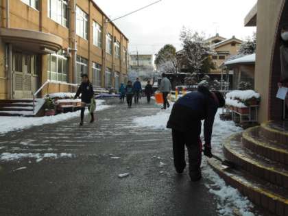 子どもたちが登校してくるときに,滑ったり転んだりすると危ないので,教職員がみんなで『雪かき』をしました。
