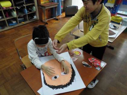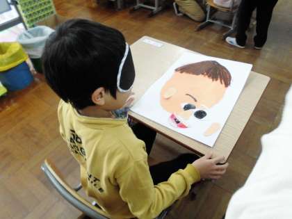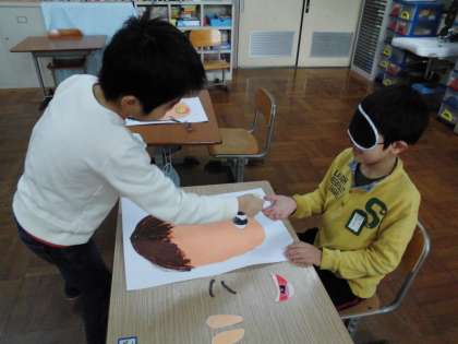 図画工作科の時間に作った福笑いで遊びました。