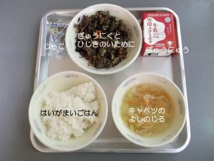 今日の献立は,『牛肉とひじきの炒め煮』『キャベツの吉野汁』『胚芽米ごはん』『牛乳』『じゃこ』でした。