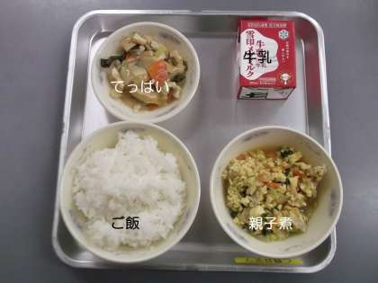 今日の献立は,『ご飯』『親子煮』『てっぱい』『牛乳』です。