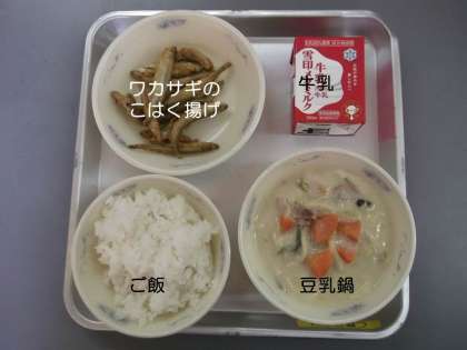 今日の献立は,『ご飯』『豆乳鍋』『ワカサギのこはく揚げ』『牛乳』です。