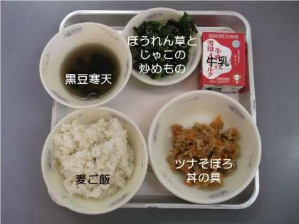 今日の献立は,『麦ご飯』『ツナそぼろ丼の具』『黒豆寒天』『ほうれん草とじゃこの炒めもの』『牛乳』です。