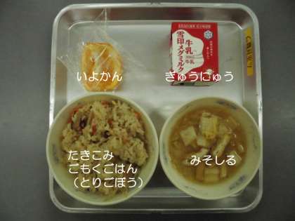 今日の献立は,『炊き込み五目ごはん(鶏ゴボウ)』『みそしる』『牛乳』『いよかん』でした。