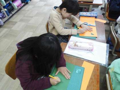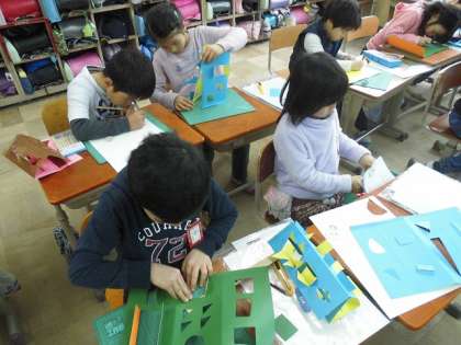 図画工作科の時間に「まどをひらいて」に取り組んでいます。カッターの使い方を学習した後は安全に気を付けて,工作用紙を切っていきます。