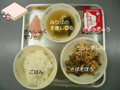 そこで,今日の給食は,『ちらしずしの具』『サバそぼろ』『三つ葉のすまし汁』『ごはん』『三色ゼリー』『牛乳』です。
