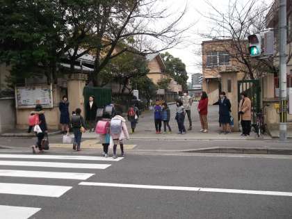 登校してきた子どもたちは,日頃見慣れない中学校の生徒会の方々が正門に立っておられるのを見て少しびっくりした表情で挨拶をしていました。