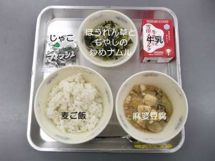 今日の献立は,『麦ご飯』『麻婆豆腐』『じゃこ』『ほうれん草ともやしの炒めナムル』『牛乳』です。