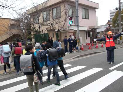 昨日より肌寒く,時折時雨れが降る中,寒さに負けず元気にあいさつ運動を行いました