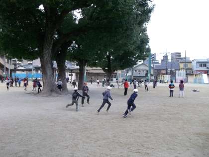運動場では,たくさんの子どもたちが元気よく友だちと遊んでいました。