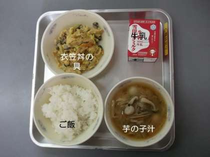 今日の献立は,『ご飯』『芋の子汁』『衣笠丼の具』『牛乳』です。