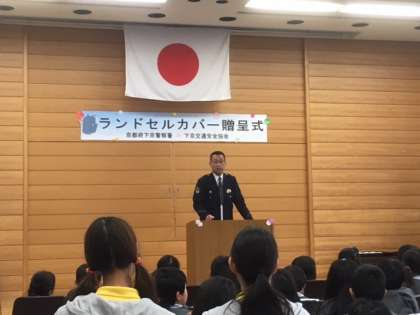 毎年,新1年生の子どもたちに,下京交通安全協会から入学のお祝いとしてプレゼントされる『ランドセルカバー』の贈呈式が,今日の10時30分より下京警察署で行われました。