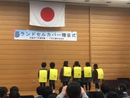 今日の贈呈式では,下京交通安全協会の会長さんや下京警察署長さんのあいさつの後,ランドセルカバーと黄色のワッペンの贈呈と披露がありました。最後に,4月から新一年生となる本願寺中央幼稚園の園児さんたちの元気な歌と交通安全宣言などがありました。