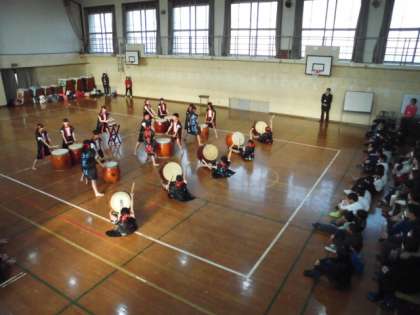 沖縄の民謡「遊び庭」をオープニングに,華やかに発表が始まりました。その後「ぶちあわせ太鼓」「大安」「HO−NEN}などを含む,6曲の見事な演奏が続きました。たくさんの観客と一体になって,素敵なひと時を過ごしました。