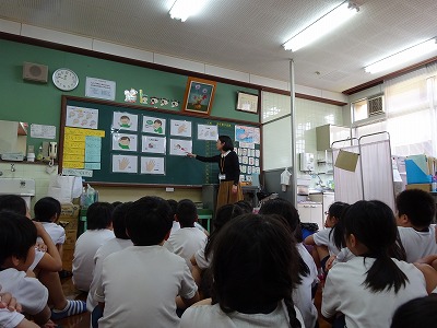 新しく七条小学校に赴任された下田先生と,はじめましてのご挨拶をしたあとに,怪我をしたときに,保健室に来る前にできることを教えていただきました。