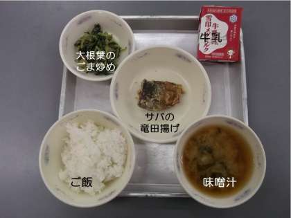 今日の献立は,『ご飯』『味噌汁』『大根葉のごま炒め』『サバの竜田揚げ』『牛乳』です。