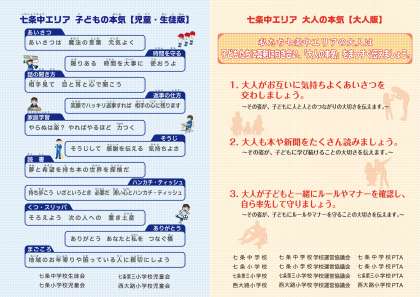 昨年度末に,七条中学校エリアの四小中学校と児童会生徒会・各PTA・各学校運営協議会が会議を開きながら意見を集約し,『子どもの本気』『大人の本気』をリーフレットにまとめました。