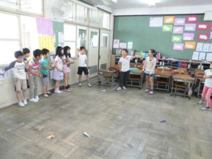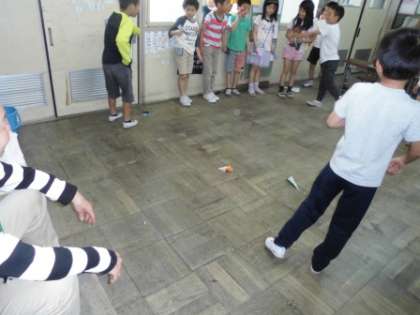 それぞれが作った紙飛行機を飛ばし,距離で競います。