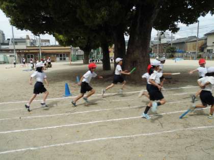 3年生からは,バトンゾーンでバトンパスをします。前を向いて全力で走り,友だちのハイっという合図で腕をさっとあげてバトンの受渡しをします。