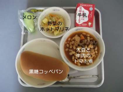 今日の献立は,『黒糖コッペパン』『大豆と牛肉のトマト煮』『メロン』『野菜のホットマリネ』『牛乳』です。