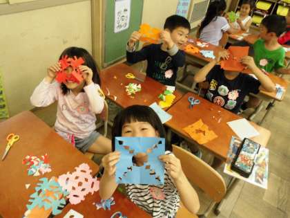 「うわぁ〜すごい!!」「おもしろい模様になったよ!」「見て!ハートの形ができたよ!」と,とても嬉しそうに話す子どもたち。