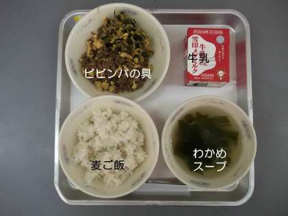 今日の献立は,『麦ご飯』『わかめスープ』『ビビンバの具』『牛乳』です。