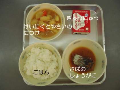 『サバの生姜煮』は,しょうがの風味がごはんによく合い,ごはんがすすむ一品です。魚料理は,少し低学年には,食べにくいおかずですが,今日は,給食カレンダーでサバの食べ方のイラストを見ながら食べました。どのようにして食べるとよいのか,また,おうちで尋ねてみてください。