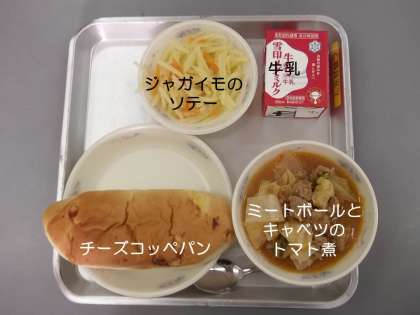 今日の献立は,『チーズコッペパン』『ミートボールとキャベツのトマト煮』『ジャガイモのソテー』『牛乳』です。