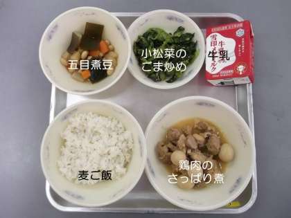 今日の献立は,『麦ご飯』『鶏肉のさっぱり煮』『五目煮豆』『小松菜のごま炒め』『牛乳』です。