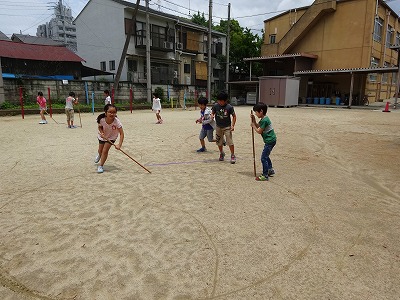 算数の「円と球」で学習したことを使って,運動場に大きな円を描いてみました。